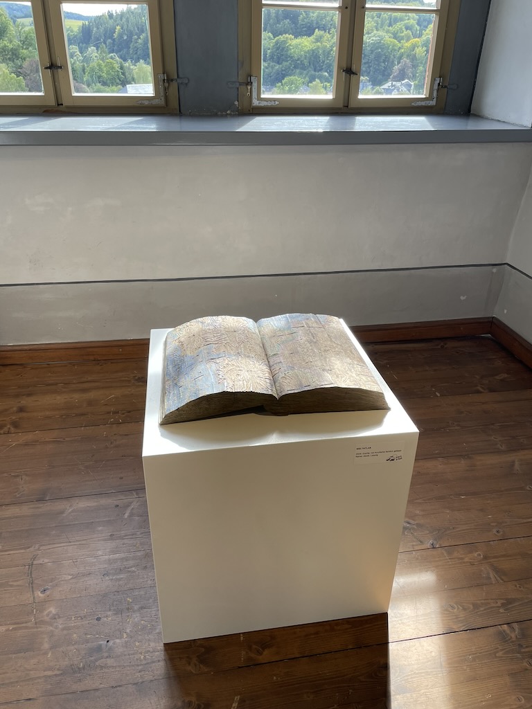 „Weltatlas“ aus der Serie „Buchdrucker“ ist eine farb­lich gefasste Holzskulptur in Form eines aufge­schla­genen Buches mit Fraßbildern des Borkenkäfers „Buchdrucker“. Von einer Brutkammer, in der die Eltern die Eier legen und befruchten, fressen sich die Holzwürmer einer Käferfamilie stern­förmig voran, bis sie ausge­wachsen sind bzw. auf die Larven einer anderen Familie treffen – die Fraßgänge berühren oder kreuzen sich nicht. So entstehen abge­schlos­sene Fraßbilder mit ähnli­chem Muster, aber verschie­dener Form und Größe, deren Rand ich farb­lich wie in einem Atlas als Ländergrenzen abge­setzt habe.