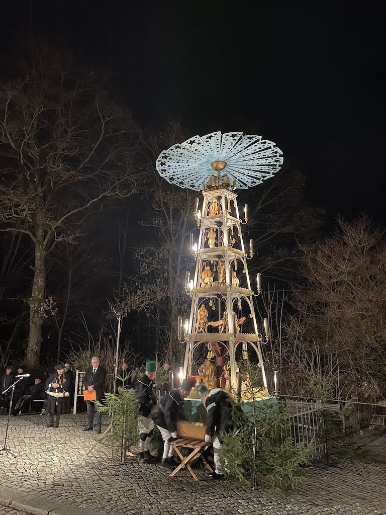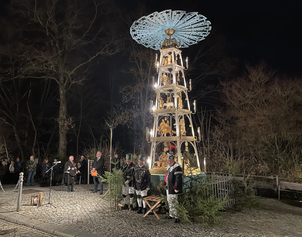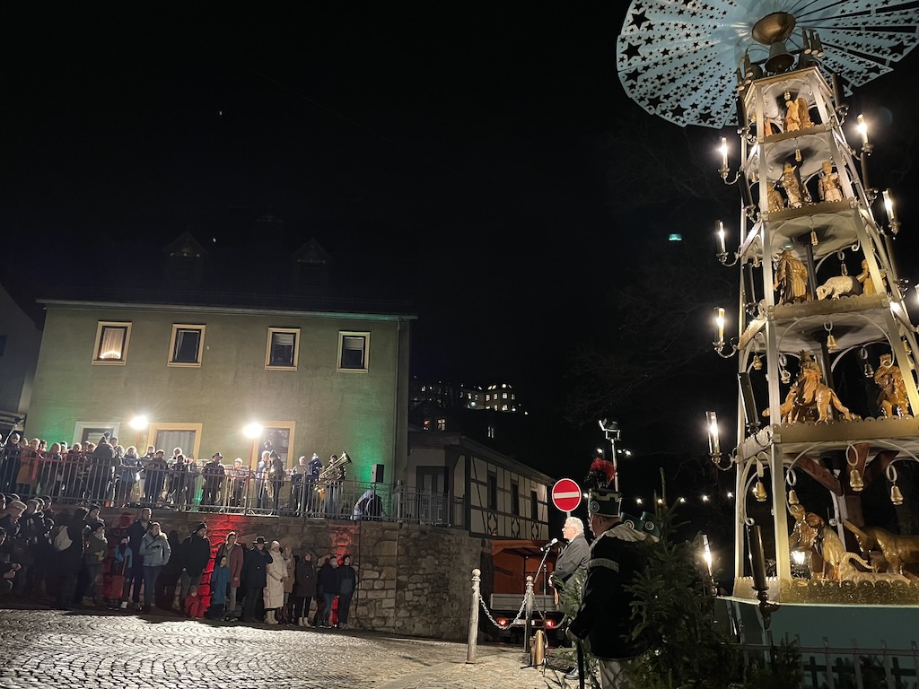 Das Programm begann 17.30 Uhr, Oberbürgermeister Ruben Gehart sagte ein paar Worte, der Schwarzenberger Türmer Gerd Schlesinger erzählte einiges aus der Geschichte der Kraußpyramide, die Jahrgang 1934 und mittlerweile 91 Jahre alt ist. Lieder von der Chorgemeinschaft Schwarzenberg und Stücke vom Posaunenchor rundeten das Ganze ab.